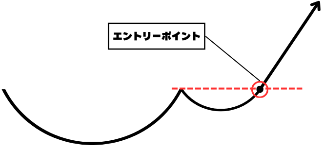 | ダブルボトム | 2度の安値がほぼ同じ水準で跳ね返る形状をしているチャートパターン。山同士を結んだ線を上抜けると上昇トレンドに切り替わる。 | ![]() |