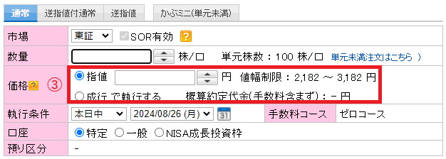 通常は100株単位での購入となるため、100株単位で買いたい株式の数量を指定します。